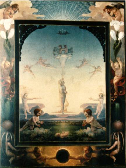 Wir sehen die Hilfsboten, die Engel der Himmel, die da zur Erde gestiegen sind, um mit den göttlichen Rosen der Liebe und den Lilien der Weisheit das menschliche Bewußtsein im Geiste zu wecken. Wie auf Wolken (=Gottwort im Buchstaben) schweben sie zur Seele und bringen ihr den ewigen Duft göttlicher Liebe und Weisheit. Daß es gerade vier Boten sind, gleich den vier musizierenden Engeln über der Jungfrau, scheint ein stiller Hinweis auf die vier Evangelisten zu sein, und für Kenner der Neuoffenbarung ein Sinnbild der vier Groß-Seher : Eckehart, Böhme, Swedenborg und Lorber.