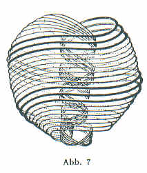 Das Atom selbst ist nichts anderes als die Äußerung einer Kraft; der Wille der Sonnengottheit (besser: unseres Gottvaters in Jesus Christus) ist auf eine bestimmte Form gerichtet, die wir ein physisches Uratom nennen (Abb.7), und durch diese Anspannung IHRES Willens werden in dieser besonderen Form ungefähr vierzehntausend Millionen "Blasen im Koilon" zusammengehalten. Es muß ausdrücklich auf die Tatsache hingewiesen werden, daß die Kohäsion (Zusammenhangskraft zwischen gleichartigen Molekülen) der Blasen innerhalb dieser Form ausschließlich von jener Willensanstrengung abhängt; würde diese einen einzigen Augenblick nachlassen, so müßten die Bläschen wieder auseinander fallen und die gesamte physische Welt würde im Nu zu existieren aufhören. So wahr ist der Satz, daß die ganze Welt selbst von diesem Standpunkt aus bloße Illusion ist, von der Tatsache ganz zu schweigen, daß die Blasen, die das Atom aufbauen, selbst ja nur Hohlräume im Koilon, dem wahren Äther des Raumes sind!