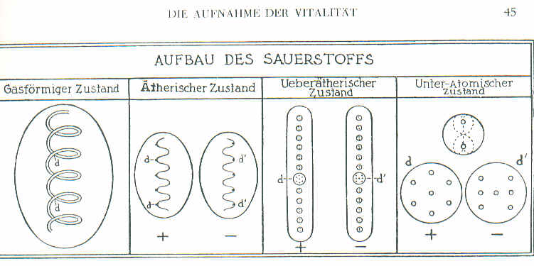 Auf der gasförmigen Ebene betrachtet, hat dieses Atom (Atom bedeutet hier die so benannte Einheit der offiziellen Chemie.-Anm.d.Übers.-) die Gestalt eines Eies, in dem ein spiralförmig gewundenes, schlangenähnliches Gebilde mit außerordentlicher Geschwindigkeit rotiert, das an den Windungen fünf glänzende, Licht ausstrahlende Punkte aufweist. Diese Spirale scheint erst ein fester, runder Gegenstand zu sein; wenn aber das Atom auf die nächste Unterebene gebracht wird (d.i. die erste ätherische Unterebene unserer physischen Welt), spaltet sich dieses Gebilde der Länge nach in zwei dünnere Spiralen, von denen die eine positiv ist, und dann zeigt es sich, daß die anscheinende Festigkeit nur der Tatsache zuzuschreiben war, daß diese Spiralen um eine gemeinsame Achse in einander entgegengesetzter Richtung rotierten und dem Beschauer so eine kontinuierliche Oberfläche darboten, gleichwie ein scheinbarer Feuerring dadurch entsteht, daß eine brennende Fackel rasch im Kreise gewirbelt wird.