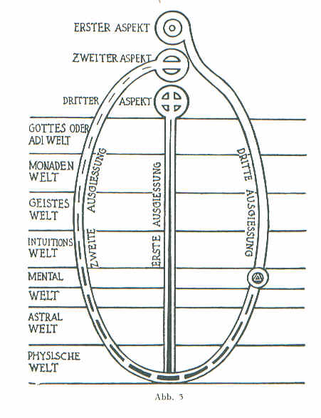 Das Schlangenfeuer gehört nicht jenem Teil der Energie des dritten Gottaspekts an, dessen er sich zum Aufbau von immer dichteren chemischen Elementen bedient. Es stellt vielmehr ein weiteres Entwicklungsstadium jener Kraft dar, die das lebendige Zentrum des Radium und ähnlicher Elemente bildet, und zählt zu jenen Erscheinungen, die durch das >Leben des dritten Gottaspekt bewirkt werden, nachdem es den tiefsten Punkt seines Herabstiegs erreicht hat und wieder zu den Höhen aufsteigt,von denen es seinen Ausgang genommen hat. Wir wissen schon seit langem, daß die zweite Lebenswoge, die vom zweiten Gottaspekt ausgeht, durch das erste, zweite und dritte Elemental-Reich bis zum Mineralreich in die Materie hinabsteigt und dann wieder durch das Pflanzen- und Tierreich zum Menschenreich aufsteigt, wo es die bis zu diesem Punkte herabreichende Kraft des ersten Gottaspektes trifft. Dieser Vorgang wird in Abb. 3 angedeutet, in welcher die linke Kurve der ovalen Figur das Herabsteigen der zweiten Ausgießung anzeigt, die ihren tiefsten Punkt auf der untersten Linie des Diagramms erreicht und dann in der rechten Kurve wieder aufwärts steigt.