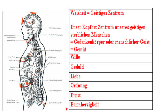 (Unsere Seele steht nicht für sich, sondern ist das Lichtkleid ihres Geburtsgeistes im Seelenherzen. Hieraus bezieht der menschliche Geist =Gedankenkörper seine Impulse und nicht nur durch Schulung von außen über Elternhaus, Schulen und Umwelt. Unsere Hinwendung zu Gott im Geburtsgeist führt zur baldigen Regentschaft durch unseren Gott- oder Weisheitsgeist, unsere Hinwendung zu Jesus bewirkt die „Eingeburt“ in unser Bewusstsein; siehe „Weg zur geistigen Wiedergeburt“ – durch Jakob Lorber)